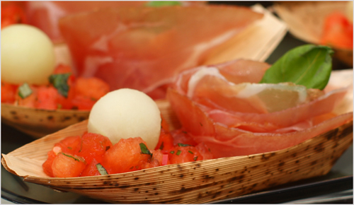 Serranoskinke med melon og mangosalsa, ruccola og granateplesalat, olivenaioli