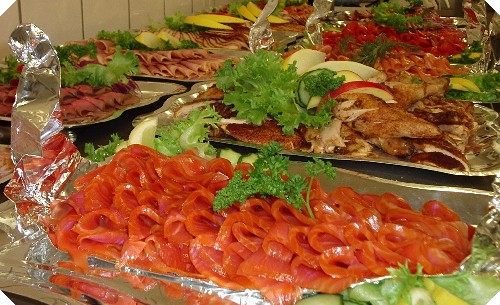 Vårt populære tapas-koldtbord til konfirmasjonsarrangement med anretninger klare til servering. Kjøtt og fisk lekkert anrettet på fat og medtilbehør i sorte gryter. Trekk av plasten, stikk i serveringsbestikk og ønsk velkommen til bords! Varmretten leveres i isolerende emballasje i aluminiumsformer og kan om ønskelig legges over i egne boller, men de fleste serverer gjerne fra formene de er levert i. |